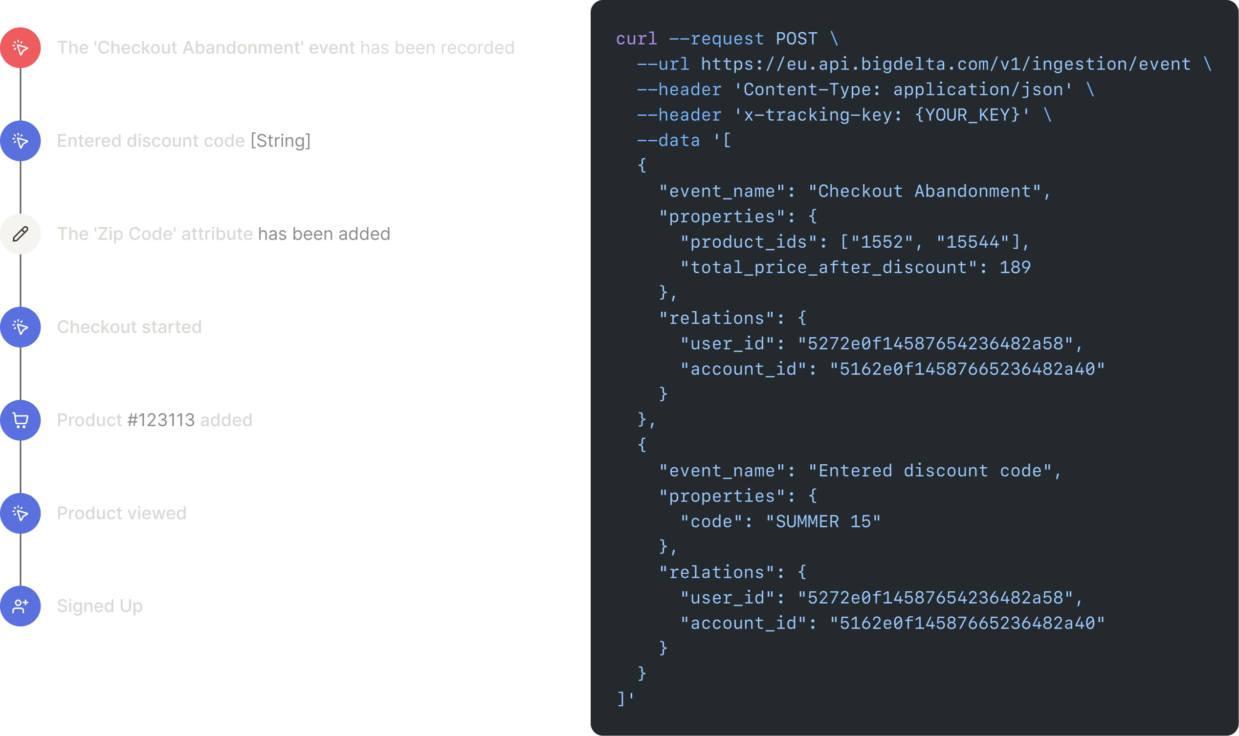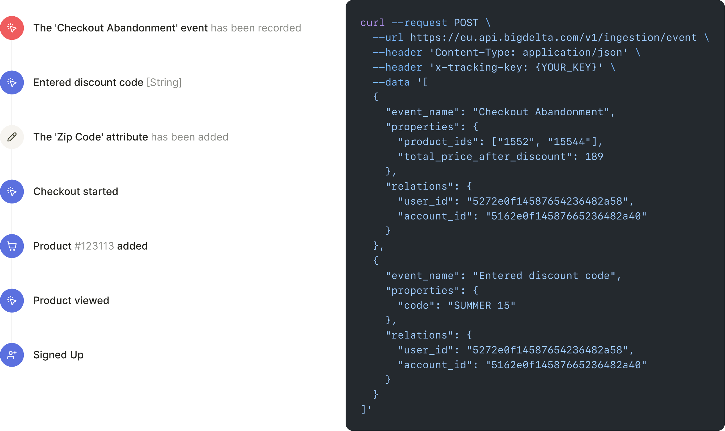 A user is the specific individual that completed an interaction with your product. Each user has a unique identifier that you can use to track their activity. This identifier can be an email address, a username, or a unique ID. Bigdelta uses a unique ID to identify users.