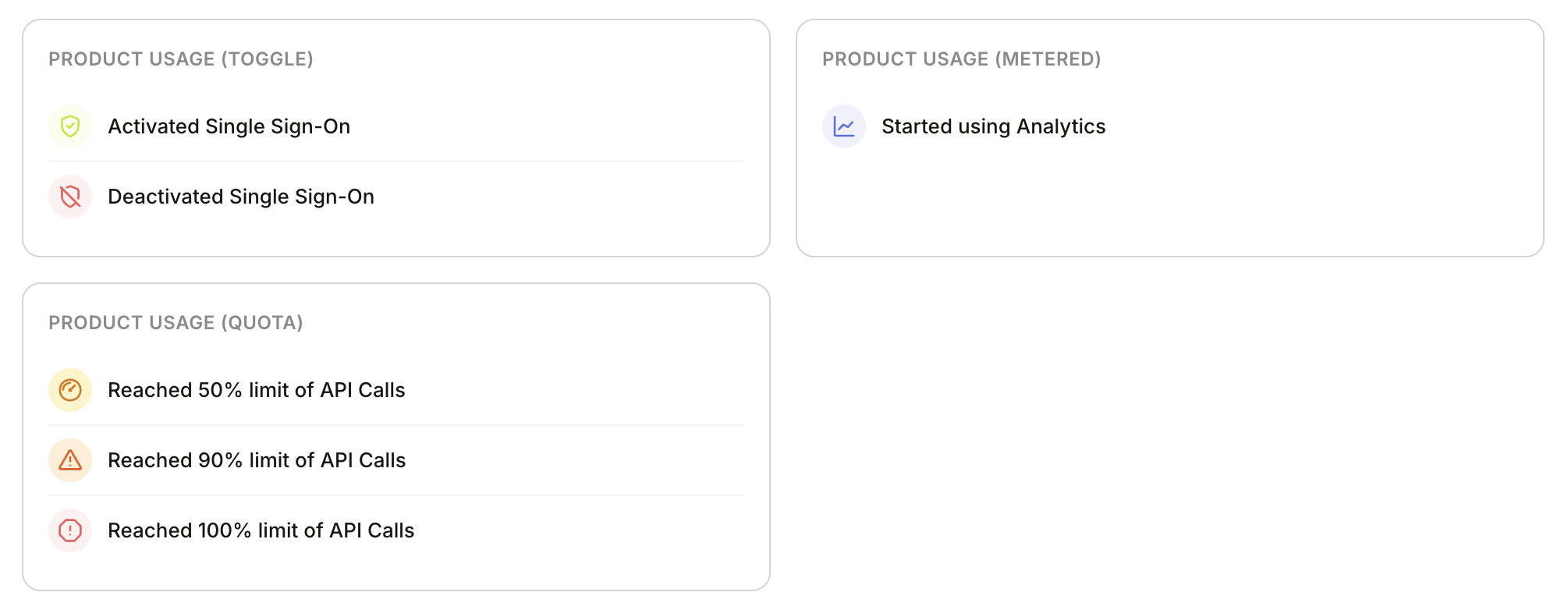 - Entitlement activities — Bigdelta tracks when accounts activate entitlements and hit usage thresholds (50%, 90%, 100% of their limit)